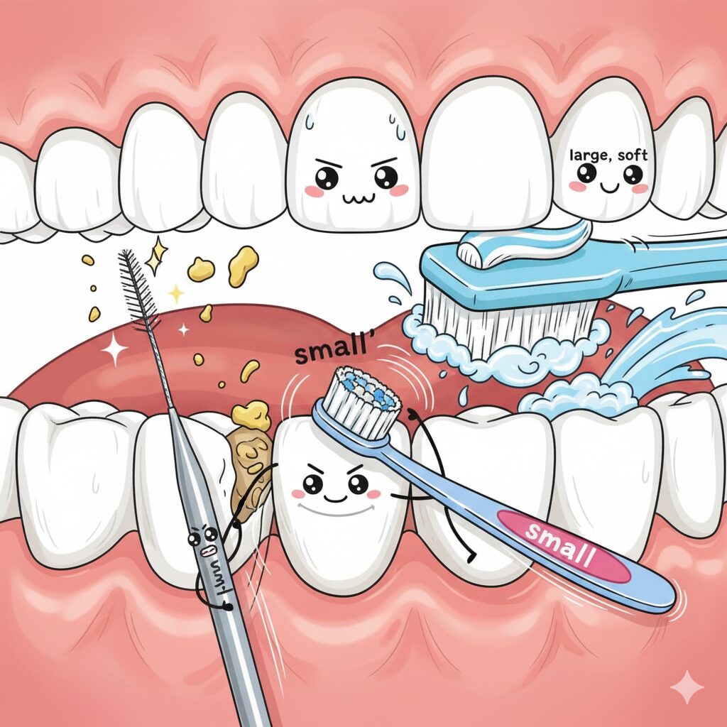 “The basic routine: interdental brush → small brush → large soft brush.”