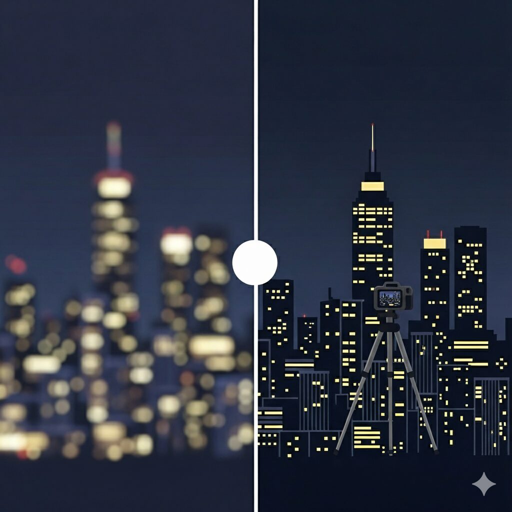 挟む理由④:夜景は三脚で固定 動きを止めてブレを防ぐ