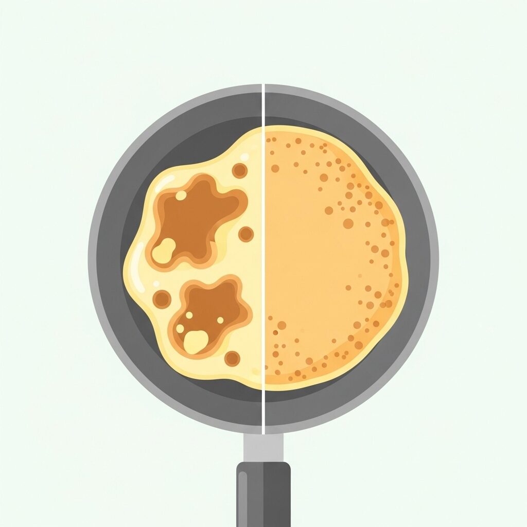 ホットケーキの生地をフライパンに流したとき、厚みにムラがあると焼き色がバラバラになります。