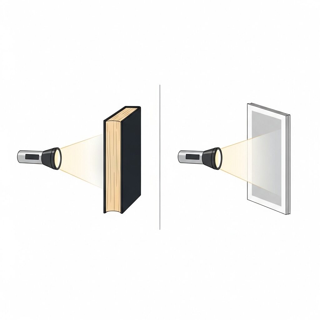 懐中電灯を当てると、分厚い辞書は光が通りにくいけど、薄い雑誌なら弱い光でも透けます。