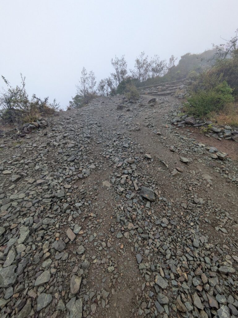 雨・強風・濃霧という悪条件の中でもペースを維持し、休憩を最小限に抑えて登りきった。