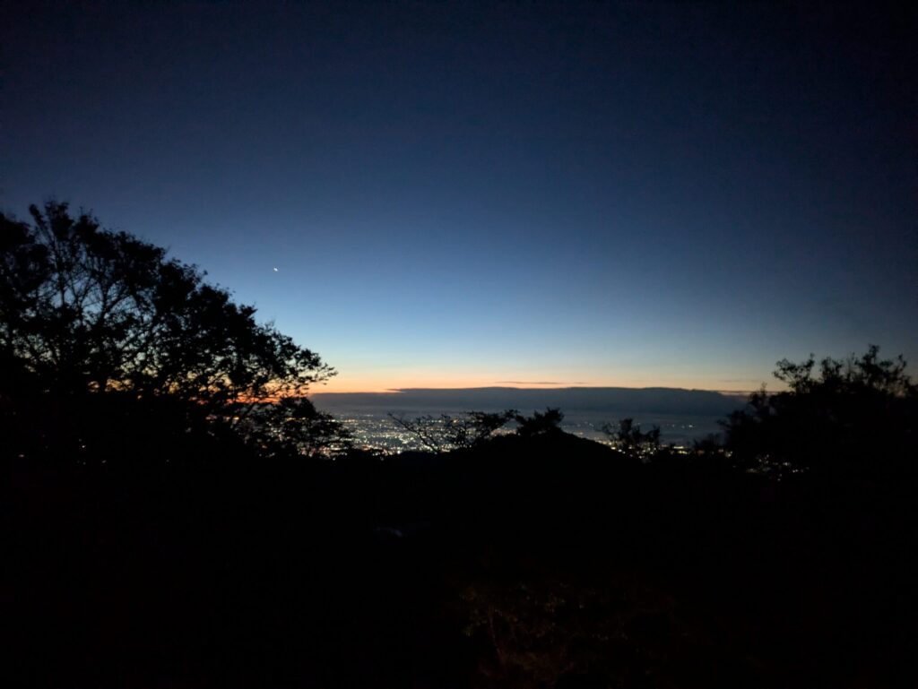 夜明け前。外に出ると、青と白が溶け合う幻想的な空。