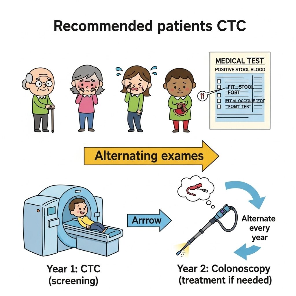 👉 Best strategy: use CTC for diagnosis, and colonoscopy if treatment is needed.
