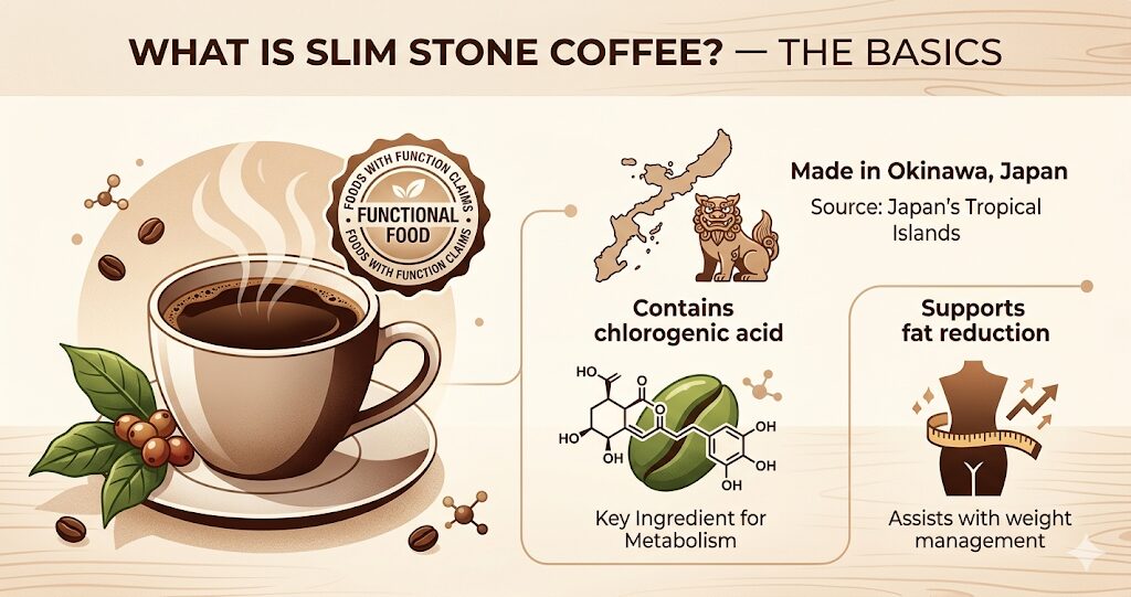 The product is called Slim Stone Coffee (スリムストンコーヒー) — a “Foods with Function Claims” certified coffee from Okinawa, Japan. And before you roll your eyes, hear me out.